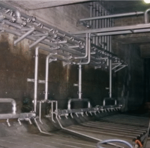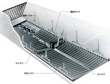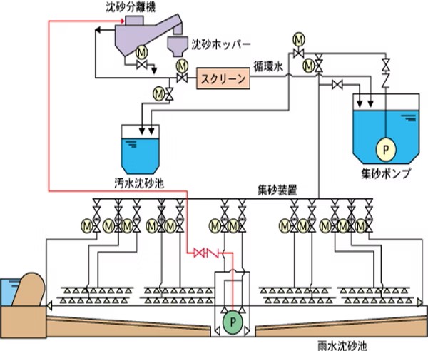 設備は、沈砂池底部に設けた集砂トラフと傾斜底盤・集砂配管・集砂ノズル・集砂切替弁・流量調整弁からなる集砂装置、集砂ポンプ、揚砂ポンプ、沈砂分離機、循環スクリーンなどから構成されます。